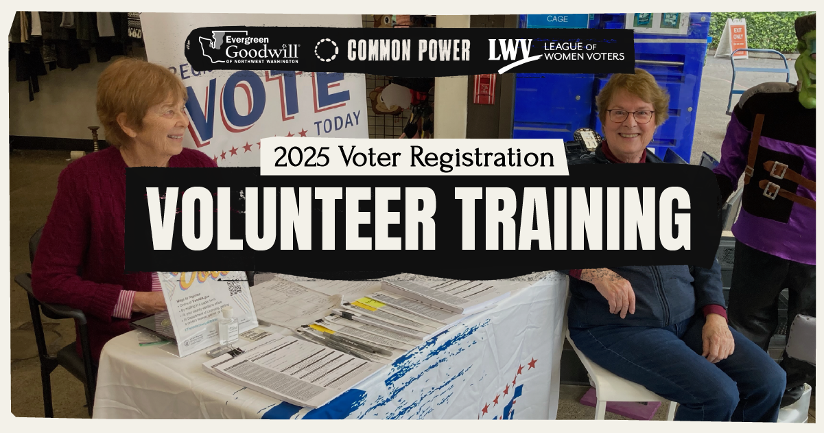 In celebration of National Voter Registration Day on September 16th, every year Common Power, League of Women Voters, and Evergreen Goodwill of Northwest Washington will be registering voters from September 13th to 16th.